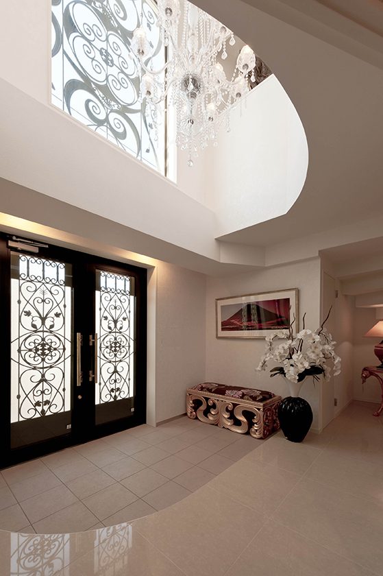 シャンデリアをはじめとするさまざまな装飾品、調度品で高級感を演出した玄関の実例です。もともと高層マンションの上階で暮らしていたご夫妻が「眩し過ぎないやさしい明るさ」を要望され、実現に至りました。