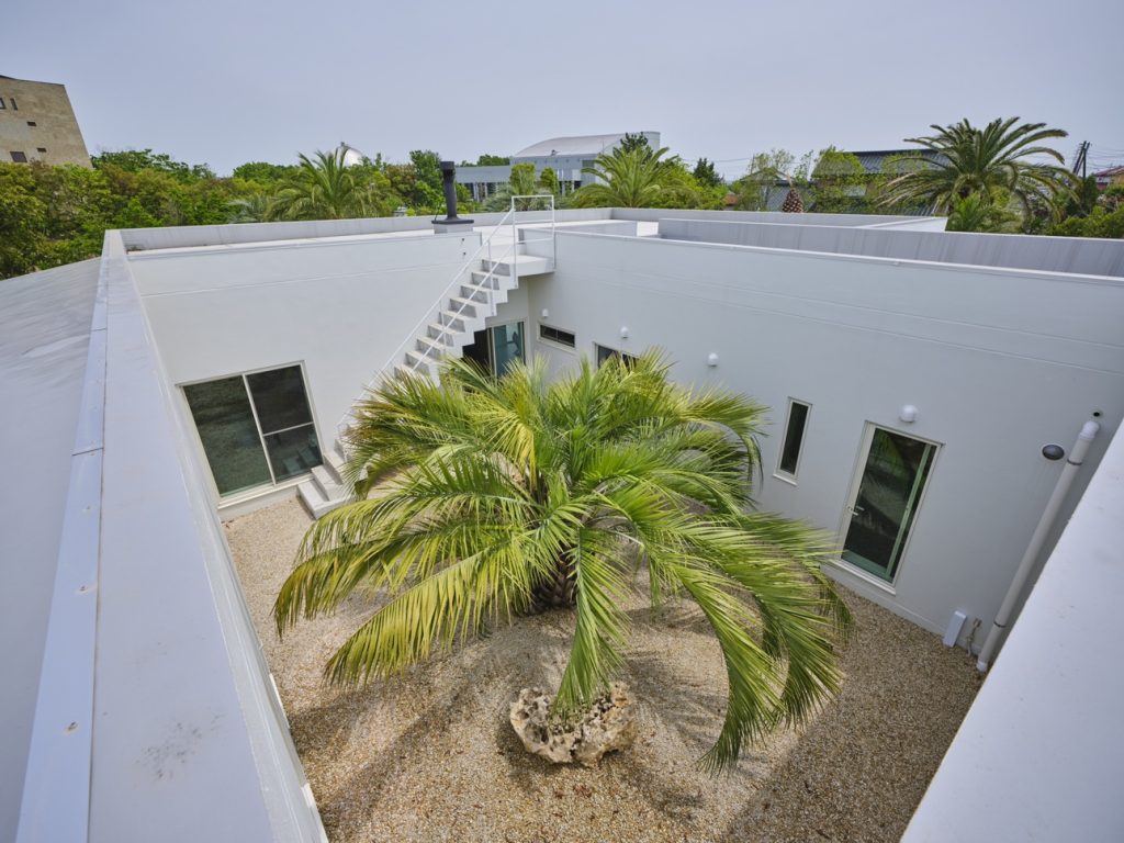 庭のテラスは室内の床とフラットにつなげ、住宅の内、外を自由に行き来してアウトドアを楽しめるように設計。アウトドアリビングやヤシの木の植栽、砂利、芝などを設けることで、景観面、機能面ともに充実した庭が完成しました。一歩庭へと出るだけで、バカンスに来たかのような気分にいざなってくれることでしょう。