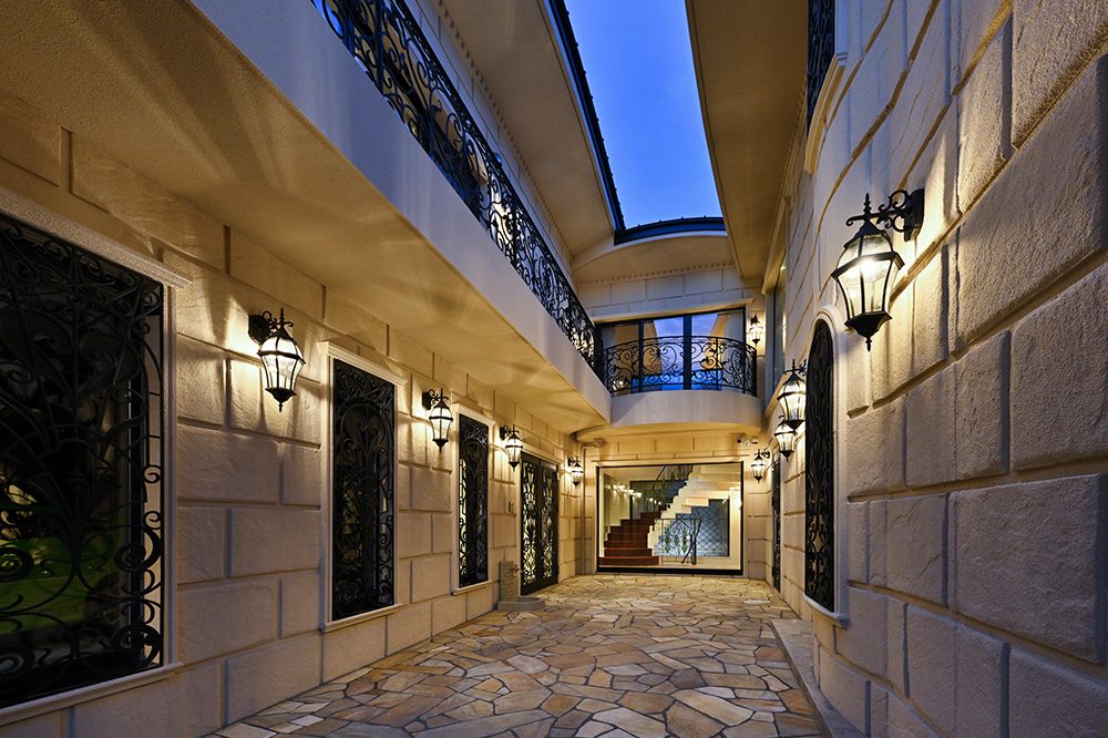 やわらかく弧を描く外壁ラインが特徴的な、ホテルライクな雰囲気がただよう中庭です。石材調の外壁とタイルを採用することで、重厚感がありながらも、夜は柔らかな照明が建物を浮かび上がらせ、非日常的な美しさを演出します。
