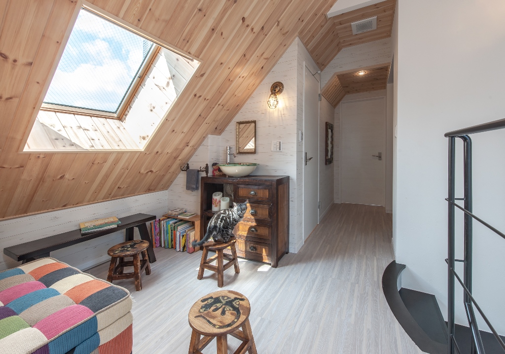 斜線制限で生まれた斜めの壁を天井と共にパイン材で仕上げ、遊び心のある空間を創出しました。